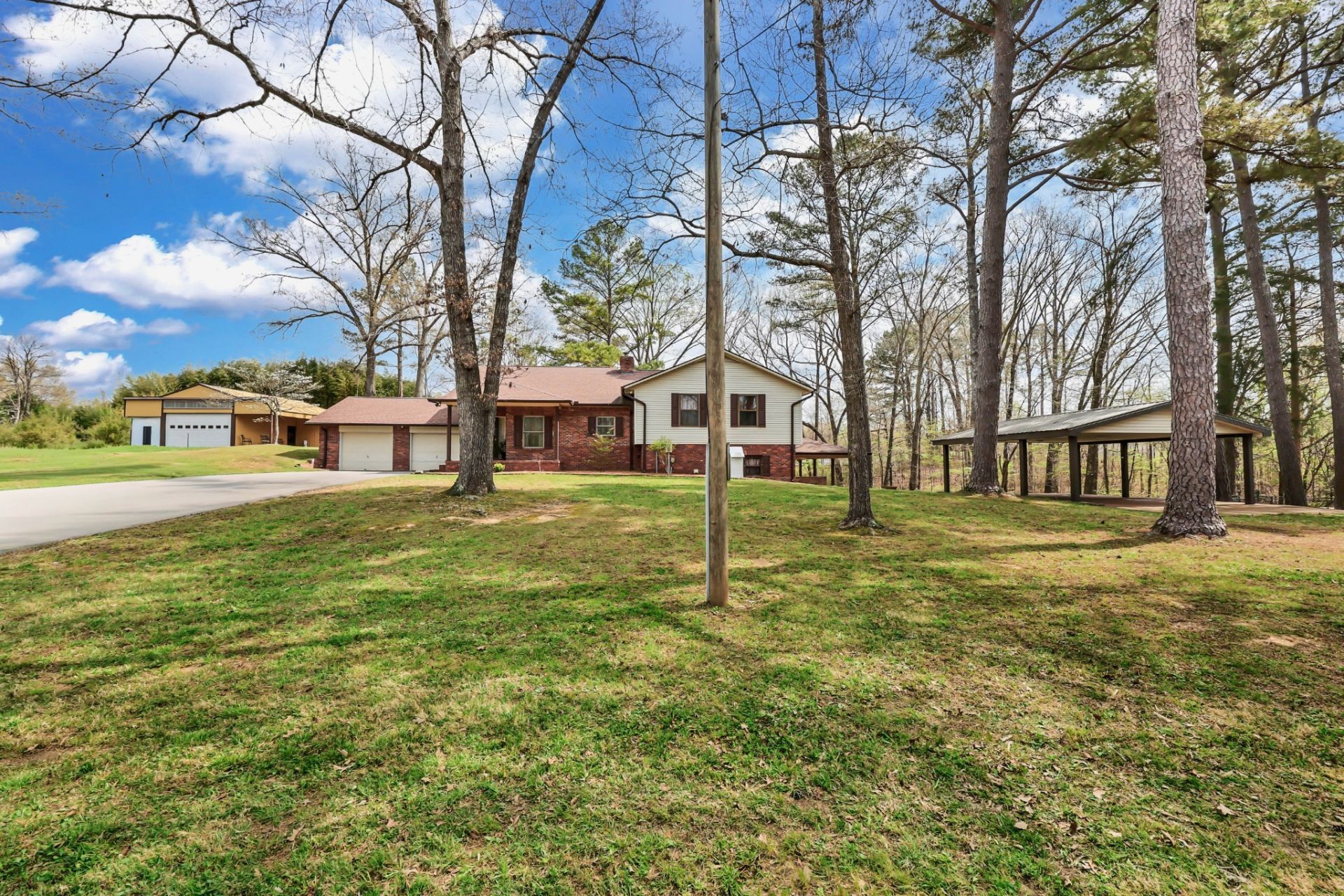 Enjoy peace and privacy on 20.8 secluded acres just minutes from Kentucky Lake. This well cared for home offers 4 bedrooms 3 full baths and a partially finished basement, providing plenty of space for family and guests. Custom designed main level kitchen complete with granite countertops, stylish tile backsplash, eating bar, pantry space, and an abundance of cabinets with pull-out features for maximum functionality. Inviting living room showcases a gorgeous stone gas fireplace as the centerpiece. Ideal for multi-generational living, the basement boasts a full kitchen, dinette area off the den and a full bath. Property includes a 40x30 metal building with propane heat and finished office space, along with a 30x24 outbuilding featuring a full kitchen, oven, stove top, a/c unit, half bath w/electric water heater, wood stove and roll up door. Perfect for pets, featuring expansive dog runs, a fenced area for dog house. Mostly Locust is a private drive, easement to 160 Mostly Locust Dr will convey.
