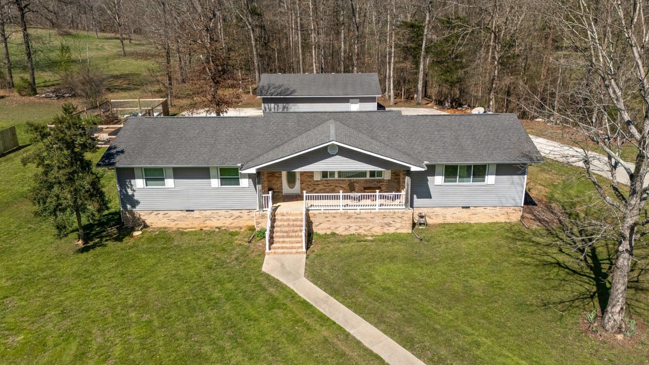 Tucked away on a peaceful 2 acre setting, this home welcomes you in the moment you turn down the long paved driveway. As you approach, you immediately notice the sense of space and privacy, along with plenty of parking for family and guests. The covered front porch invites you to slow down for a moment. It is the kind of porch made for rocking chairs, morning coffee, and taking in the beautiful mountain and wooded views stretching out in front of you. Step inside and you are greeted by a warm, light filled living room where beautiful hardwood floors and large windows frame the scenery outside and fill the home with natural light. From here, the home naturally opens in multiple directions.To the left is the private bedroom wing with two comfortable guest bedrooms and the primary suite, which features its own attached bath that also offers convenient hall access for guests. This hallway also includes nice organizational/storage spaces in the coat closet immediately inside the front door, as well as a hallway linen closet.Straight ahead from the living room, you enter the dining room and kitchen, creating a light infused natural gathering space in the heart of the home. French doors open from this area to the back patio, making it easy to step outside and extend meals and time with family into the outdoor space. From the kitchen, the layout continues to the right where you will find a full bathroom, a large den or family room perfect for relaxing or hosting, and the laundry area. The living areas feel open and spacious with an abundance of natural light filling each room. All appliances are within 3-4 years old. Outside, the property continues to shine. The patio and driveway area provide plenty of space for cookouts, celebrations, and enjoying the peaceful surroundings. The oversized detached garage offers 1200 sq.ft of insulated space for parking, storage & workspace, and even includes RV electrical hookups!